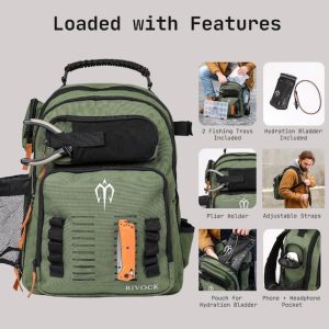 RIVOCK Fishing Tackle Backpack: Insulated Cooler, 2 Tackle Boxes, Hydration Bladder, Rod Holders